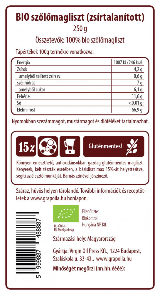 A szőlőmagliszt könnyen emészthető és koleszterinmentes. Pozitív élettani hatásai miatt érdemes sütőipari adalékanyagként használni. Kelt tészták esetén segíti az élesztő munkáját, ráadásul kiváló színezőanyag, ezért kenyérfélékhez és egyéb tésztákhoz is bátran adható.