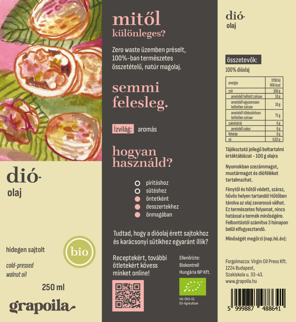 Az egyik legkellemesebb aromájú és ízű, hidegen sajtolt növényi olajunk. Linolsav tartalmának köszönhetően erősíti az immunrendszert.