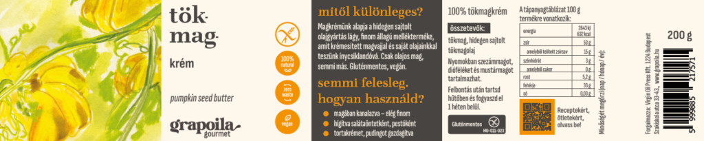 Tökmagkrémünk olajtök magjából, pörkölés nélkül, hideg sajtolással készül. Ízesíthetünk vele tésztákat, süteményeket, salátákat, készíthetünk felhasználásával mártogatósokat, szendvicskrémeket.