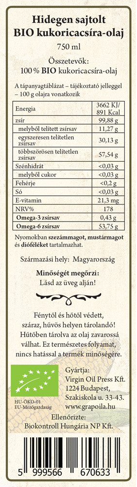 Kukoricacsíra-olaj BIO 750 ml