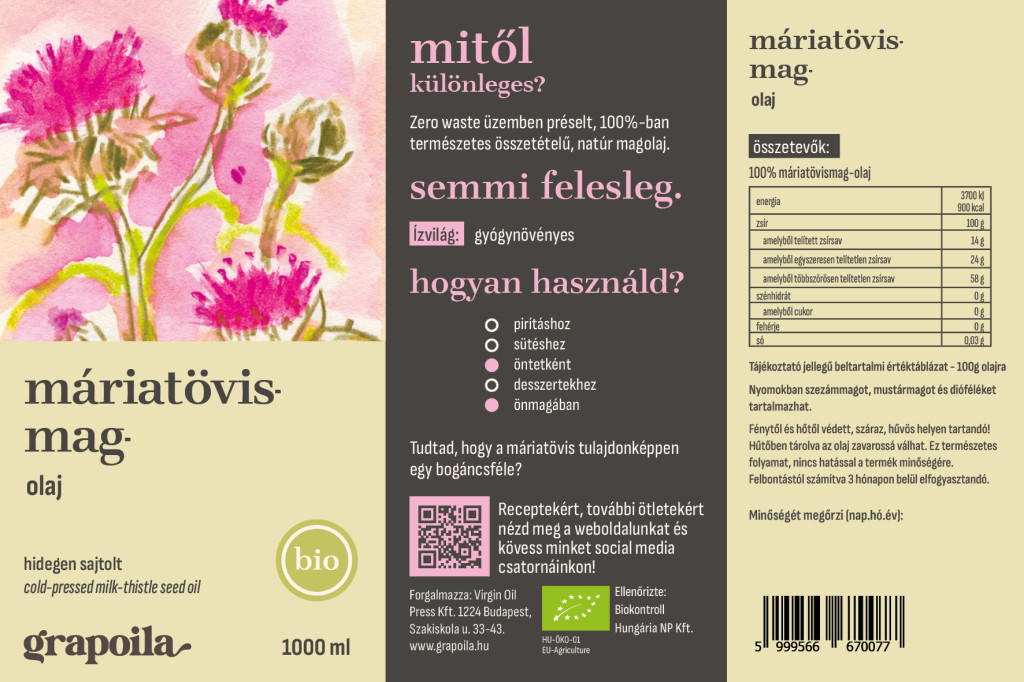 Élénksárga színű, kellemes, lágy vajízű olaj. A máriatövis már évszázadok óta használt gyógynövény. Rendkívül gazdag esszenciális zsírsavakban és E-vitamin tartalma is jelentős.