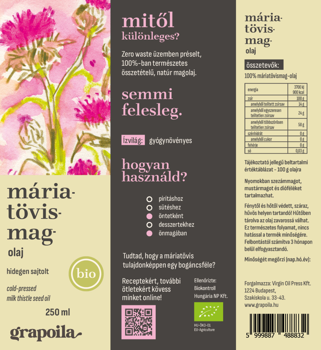 Élénksárga színű, kellemes, lágy vajízű olaj. A máriatövis már évszázadok óta használt gyógynövény. Rendkívül gazdag esszenciális zsírsavakban és E-vitamin tartalma is jelentős.