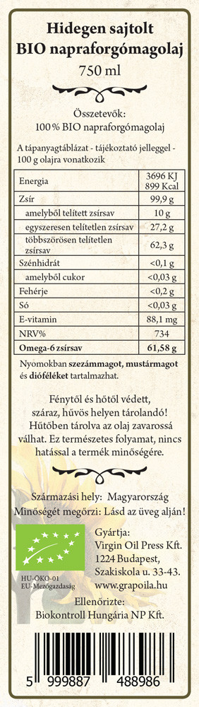 Sárga színű, pirított napraforgóra emlékeztető illatú olaj. Hazánk egyik legismertebb és legtöbbet használt olaja, hidegen sajtolt változatban. Az élénksárga, nap felé bólogató, lenyűgöző táblákban virító növény a nyár egyik kedvence, olaját a népi gyógyászatban nehezen gyógyuló sebek és száraz, pikkelyesen hámló bőr kezelésére használták.