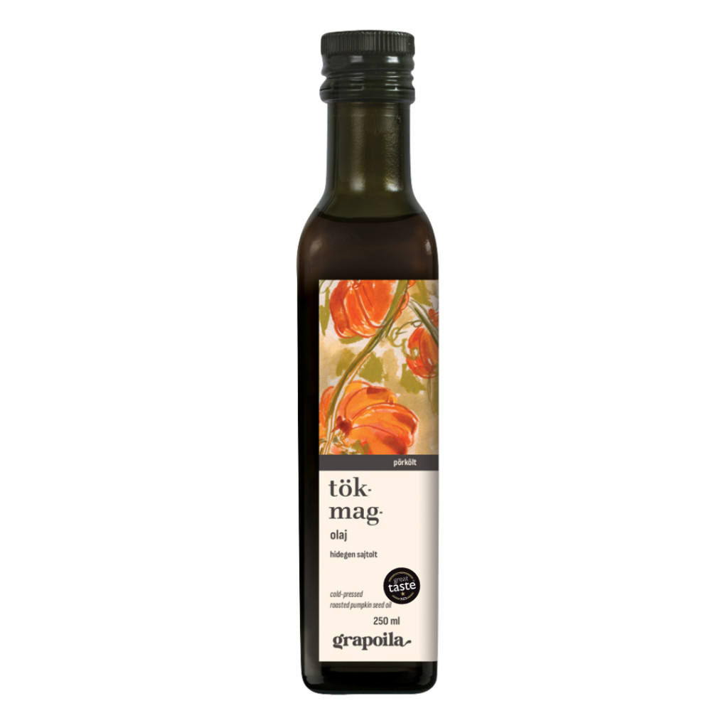 Itt a Grapoila legújabb tökmagolaj-változata – pörkölt tökmagból! Az gyártási eljárás változatlanul a mechanikai sajtolás, de a magokat préselés előtt finoman megpörköljük. Igaz, hogy így veszítünk egy keveset a hőérzékeny vitaminokból és tápanyagokból, viszont a pörkölt magból sajtolt olaj olyan szintű kulináris élvezetet nyújt, ami az ínyencek számára megér ennyi áldozatot. (Aki a tökmagolaj áldásos hatásai miatt fogyasztaná ezt az olajat, az továbbra is megtalálja kínálatunkban a pörköletlen magból sajtolt változatot, a mag teljes tápanyagarzenáljával.)