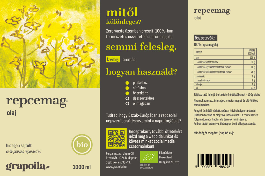 A repcemagból kinyert olaj semleges ízű és illatú alapanyag. Tökéletes a napraforgóolaj helyettesítésére, nem hőérzékeny, füstpontja magas, így bátran használhatjuk sütéshez, pároláshoz. Emellett tésztákat, salátákat és zöldségeket is ízesíthetünk vele, majonézt is készíthetünk a segítségével.