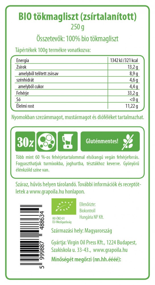 Lisztünket bio gazdálkodásból származó héj nélküli olajtök magjából készítjük. A tökmagliszt íze és illata jellegzetesen "tökmagos", színe élénkzöld. A gluténmentes tökmagliszt fogyasztását kifejezetten ajánljuk vegán étrendet követőknek, hiszen kiemelkedően magas a fehérjetartalma, ráadásul 8-féle esszenciális aminosav található benne, ezáltal aminosav-összetétele is szinte tökéletes. Szénhidrát- és zsírtartalma ugyanakkor alacsony, így jól illik az alacsony energiatartalmú diétákba is. Foszfortartalma segíti az agyi és idegi működést, lassítja az időskori agyi leépülés folyamatát. Rendszeres fogyasztása jótékony hatással bír a hólyag- és prosztata megbetegedésekre.